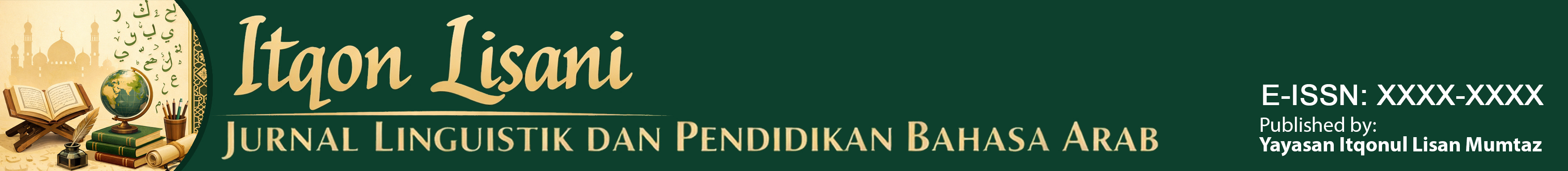 Itqon Lisani: Jurnal Linguistik dan Pendidikan Bahasa Arab is a peer-reviewed academic journal focusing on Arabic linguistics and Arabic language education E-ISSN: XXXX-XXXX. The journal is published by Yayasan Itqonul Lisan Mumtaz and professionally managed by an editorial board consisting of scholars from multiple higher education institutions. The journal aims to disseminate high-quality research findings, conceptual studies, and critical analyses that contribute to the advancement of Arabic linguistics and Arabic language pedagogy at national and international levels. Itqon Lisani is published three times a year and welcomes original manuscripts written in Arabic or English, addressing contemporary issues, theoretical developments, and practical applications in Arabic linguistics and Arabic language education.